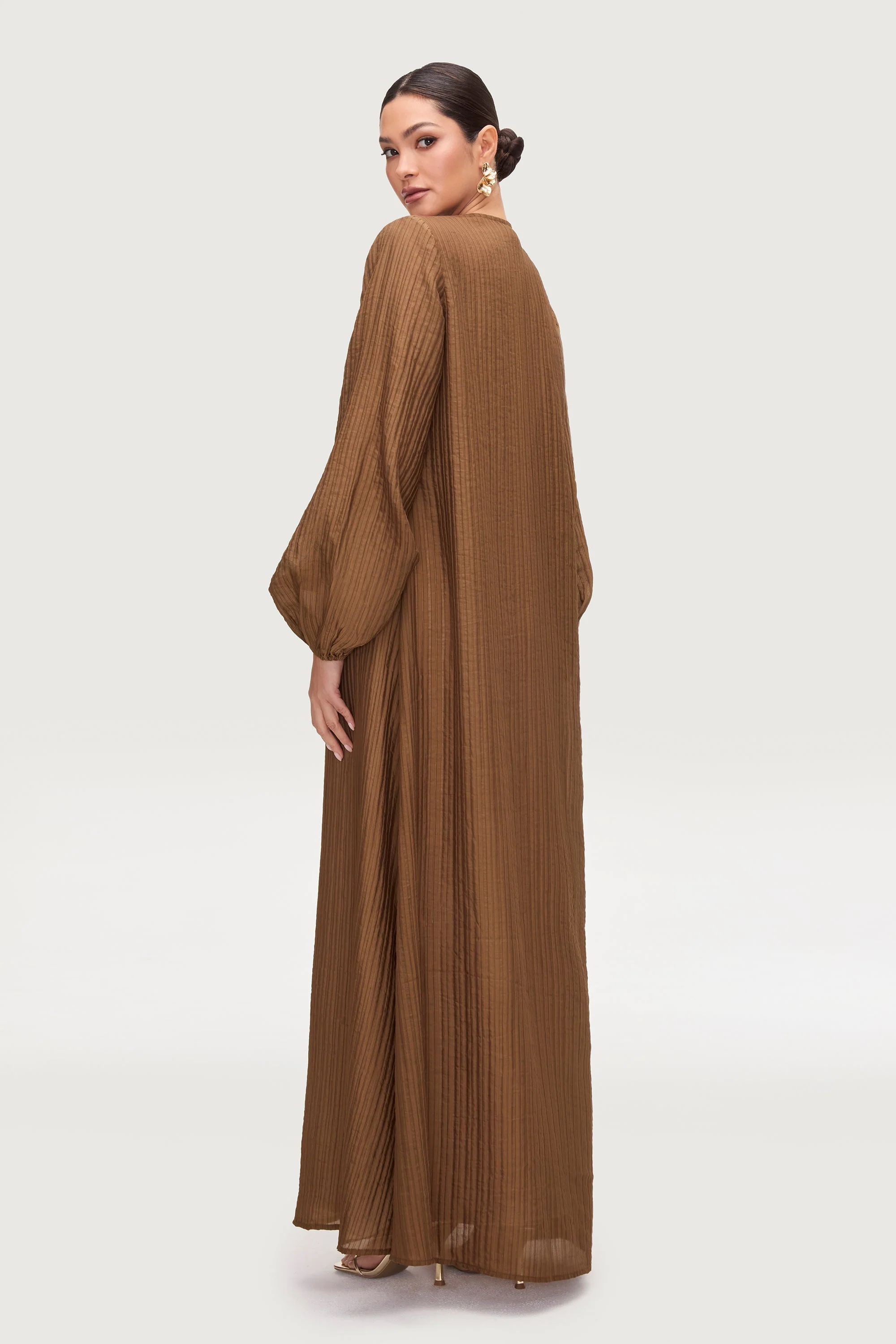 Unleash your inner elegance with the Lamya Balloon Sleeve Open Abaya in Desert Palm. This elevated basic features stunning balloon sleeves, adding a touch of sophistication to your look. The textured fabric, with subtle stripes, creates a luxurious feel while remaining breezy and comfortable. Elevate your wardrobe with this must-have piece.