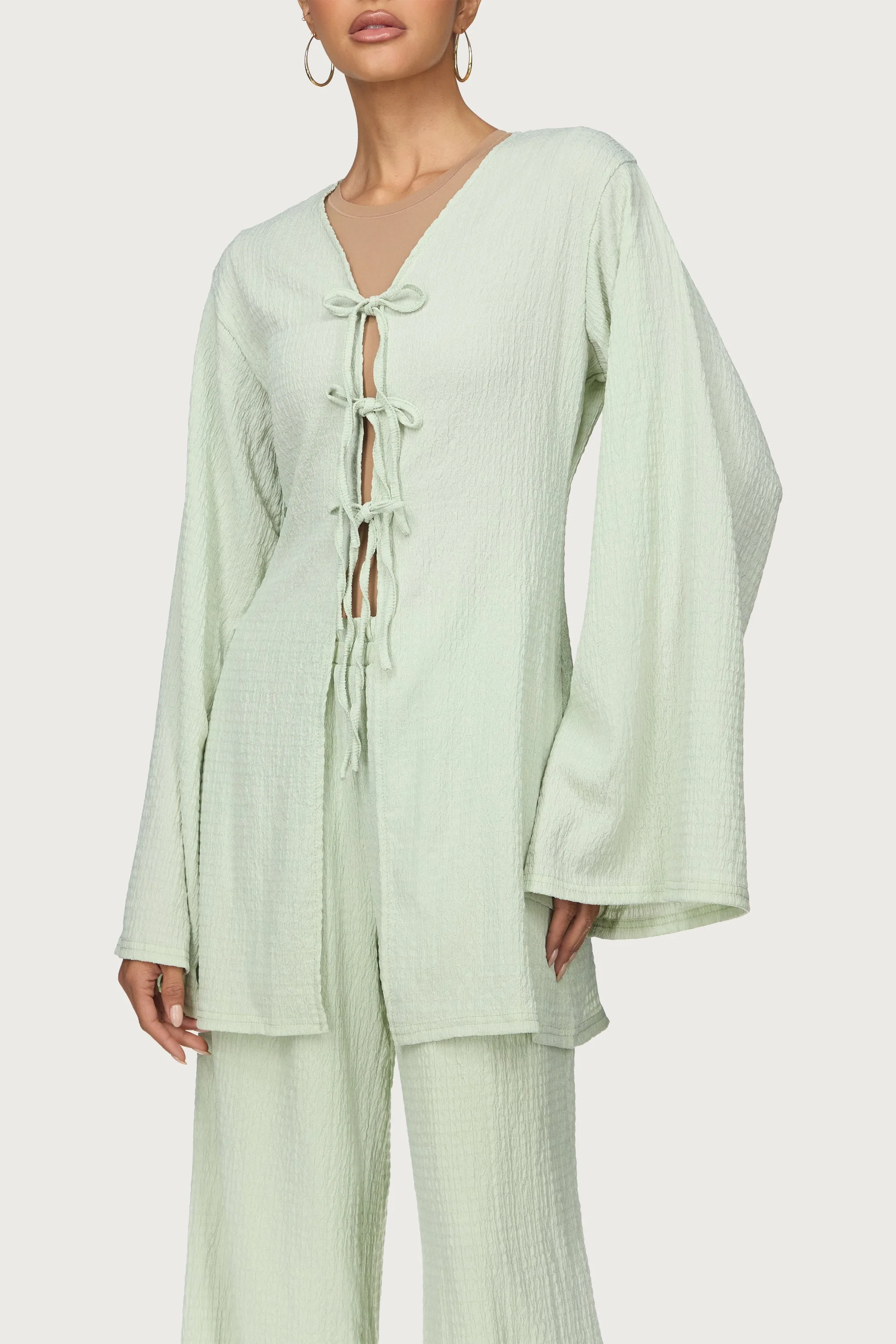 Elevate your wardrobe with the Layla Matching Top & Pants Set in Pistachio. Featuring a tie-front top with elegant flare sleeves crafted from lightweight textured fabric, this set offers both comfort and refined style. The coordinating wide-leg pants create a harmonious silhouette, perfect for sophisticated occasions or effortless chic looks.