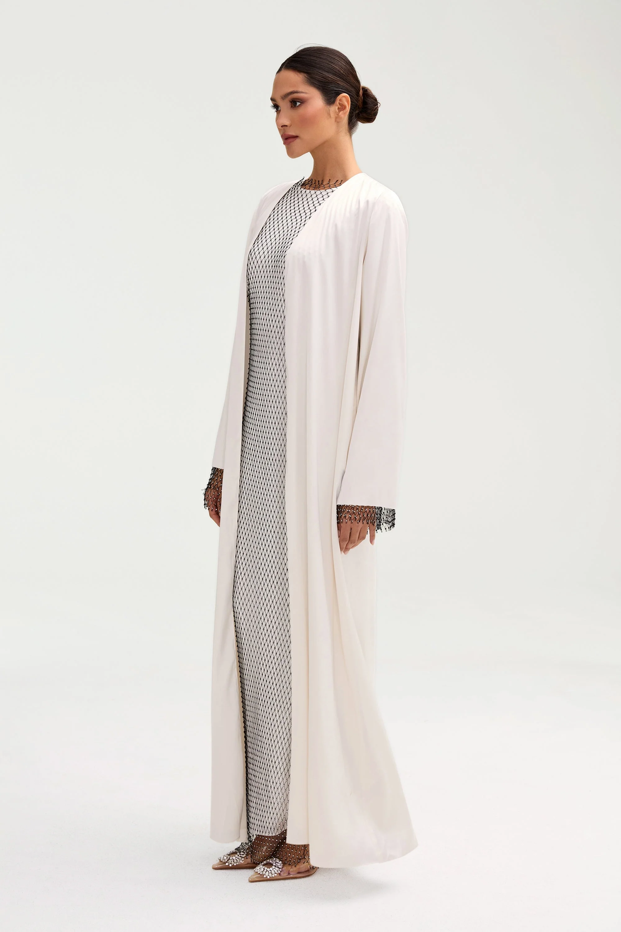 Introducing the Lyana Crystal Mesh Satin Abaya in White. This luxurious abaya features exquisite crystal mesh detailing on the sleeves, adding a touch of sophistication to any outfit. Made with high-quality satin, this abaya exudes luxury and exclusivity. Elevate your wardrobe with this must-have piece.