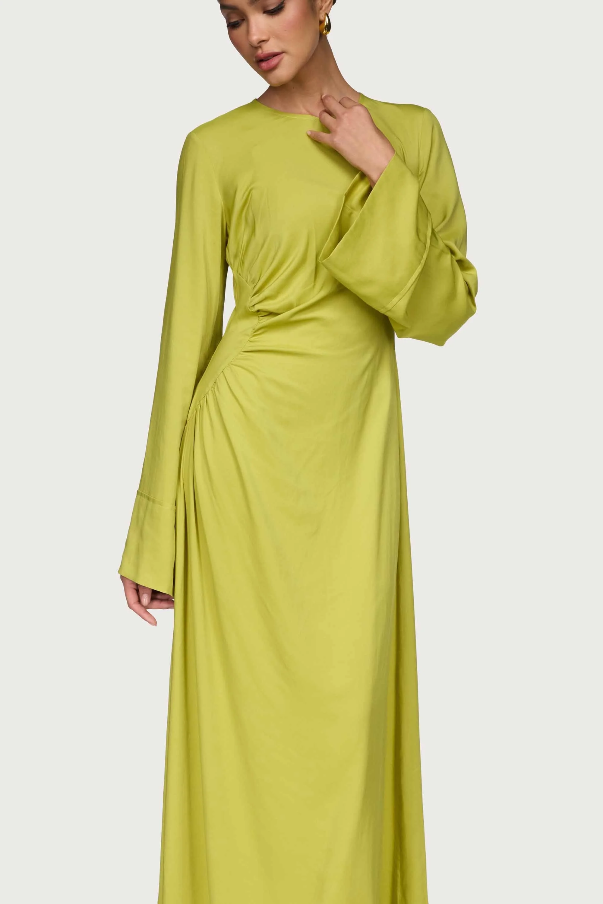 Indulge in elegance with our Mais Asymmetric Maxi Dress in Pear. This versatile maxi dress features beautiful cuff sleeves and asymmetric pleat detailing, effortlessly adding a touch of luxury to your wardrobe. Perfect for any occasion, this dress exudes sophistication and style.