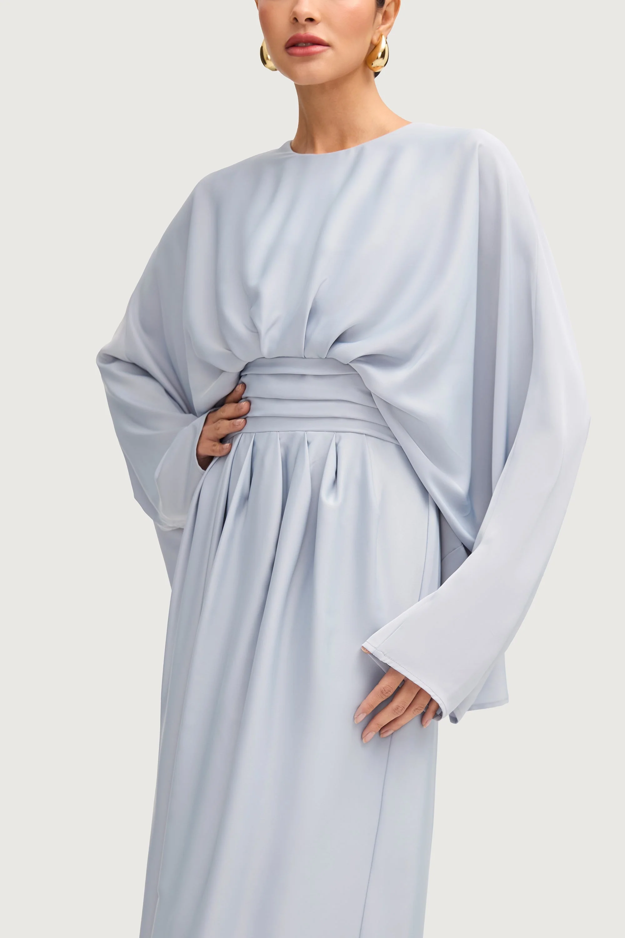 Indulge in elegance with our Maleeka Satin Drape Maxi Dress in Pastel Blue. The banded waist and pleated wrap front create a stunning silhouette, while the satin cape overlay adds a touch of luxury. The beautiful drape and flowy design exude sophistication and grace. Elevate your style with this maxi dress.