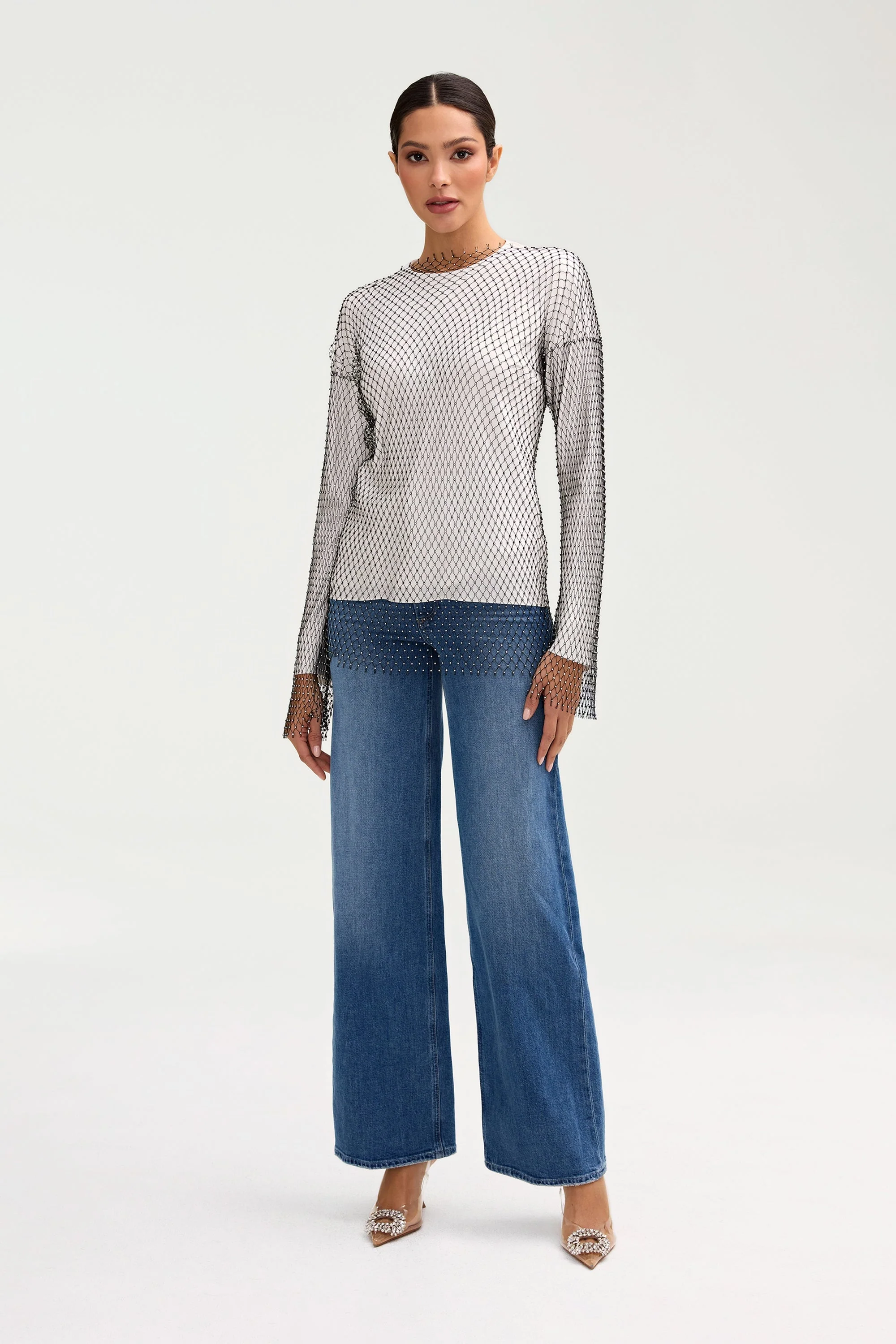 Indulge in luxury with the two piece Sania Crystal Mesh Satin Top in White. This classic top features a sumptuous satin fabric and a decadent crystal mesh overlay, bringing a touch of elegance to any outfit. Elevate your style with this exclusive piece.