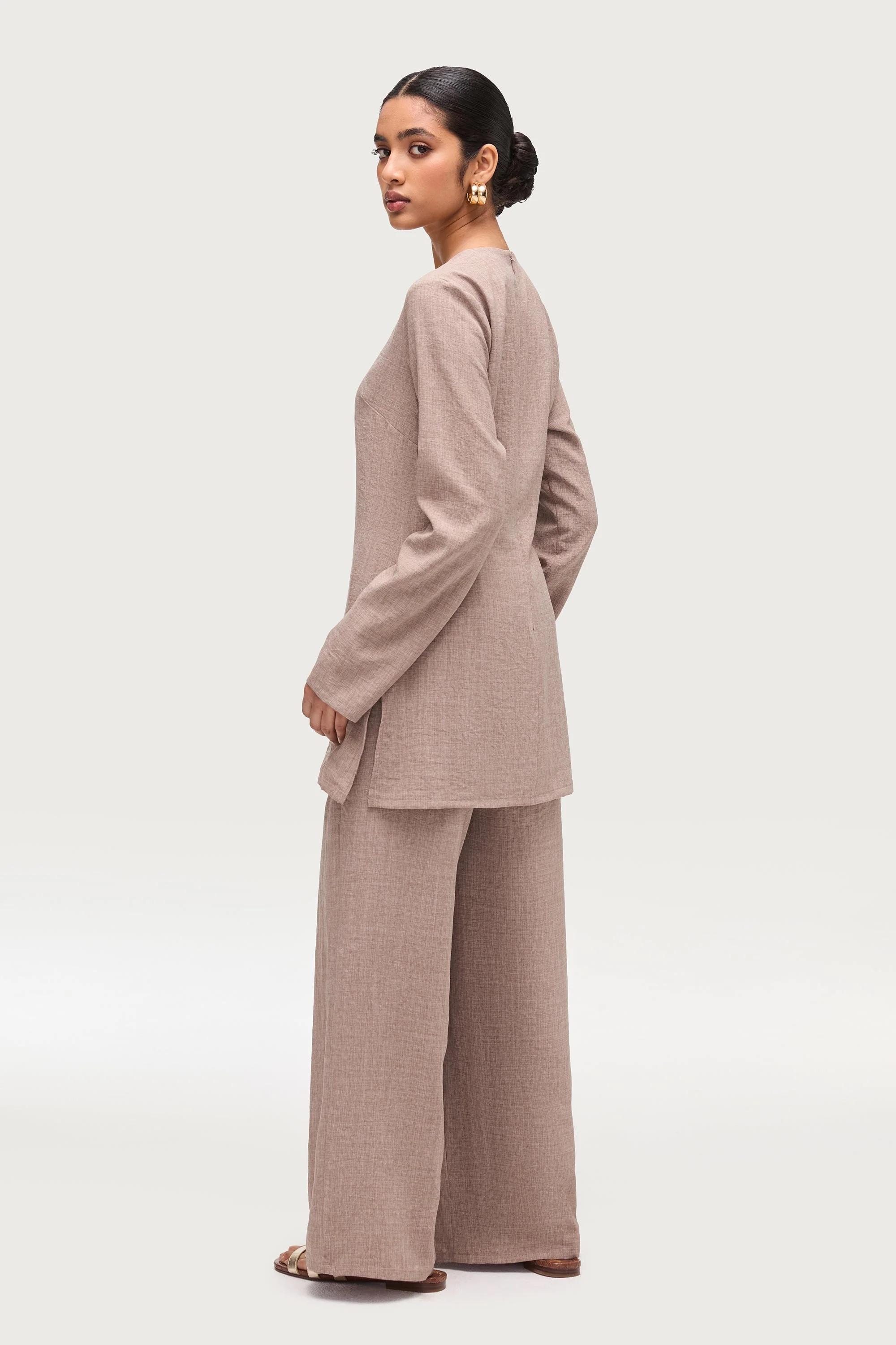 Indulge in understated luxury with our Sana Side Slit Relaxed Top in Truffle. Designed with a versatile and elevated style, this top features a relaxed fit and a side slit for added comfort and sophistication. Perfect for dressing up or down, it's a must-have in any wardrobe.