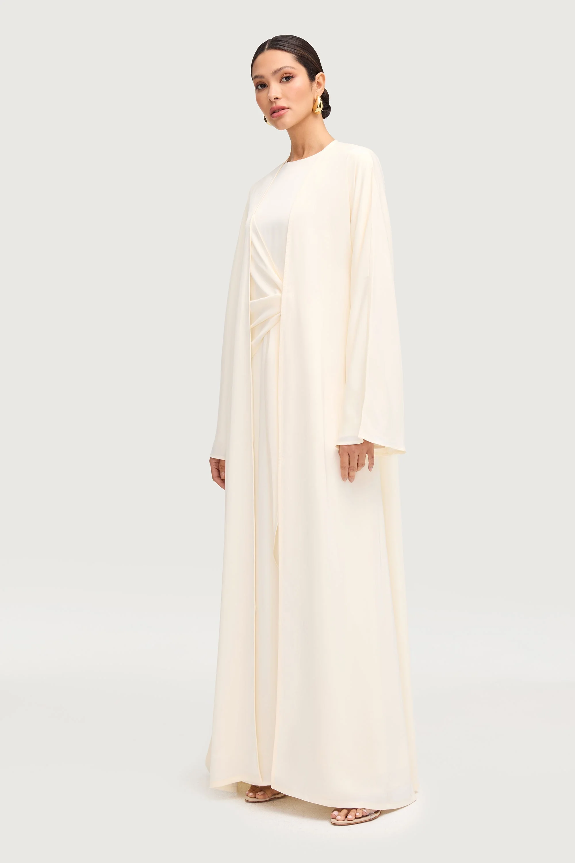 Indulge in luxury with our Sofia Satin Open Abaya in Off White. Crafted from premium satin, this abaya boasts wide sleeves and an open front for a comfortable yet elegant fit. Perfect for any occasion, elevate your wardrobe with this sophisticated piece.