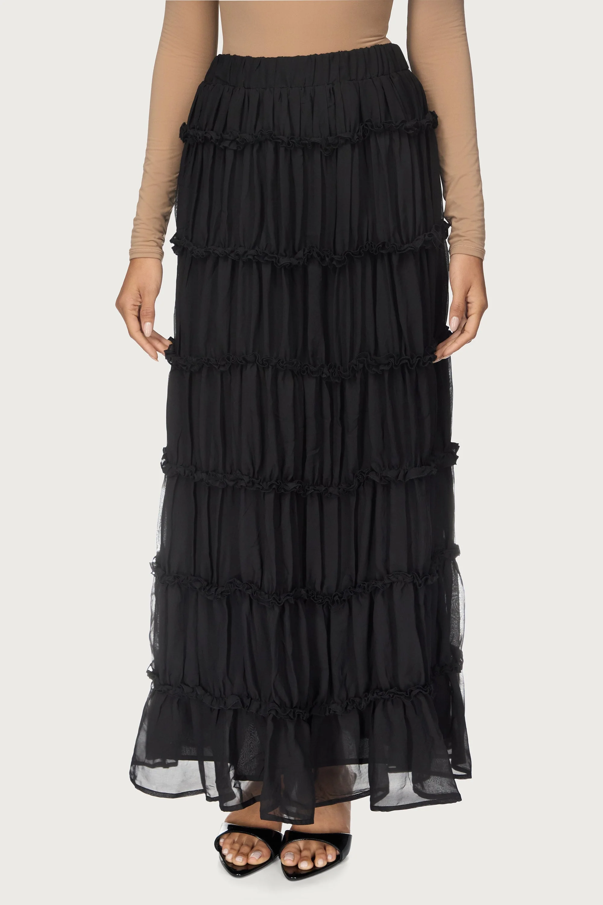 Elevate your wardrobe with our Tiered Maxi Skirt in Black. Its lightweight fabric flows gracefully, creating a sophisticated silhouette perfect for any occasion. The tiered design adds subtle texture and movement, making it a timeless piece that combines comfort with refined style.